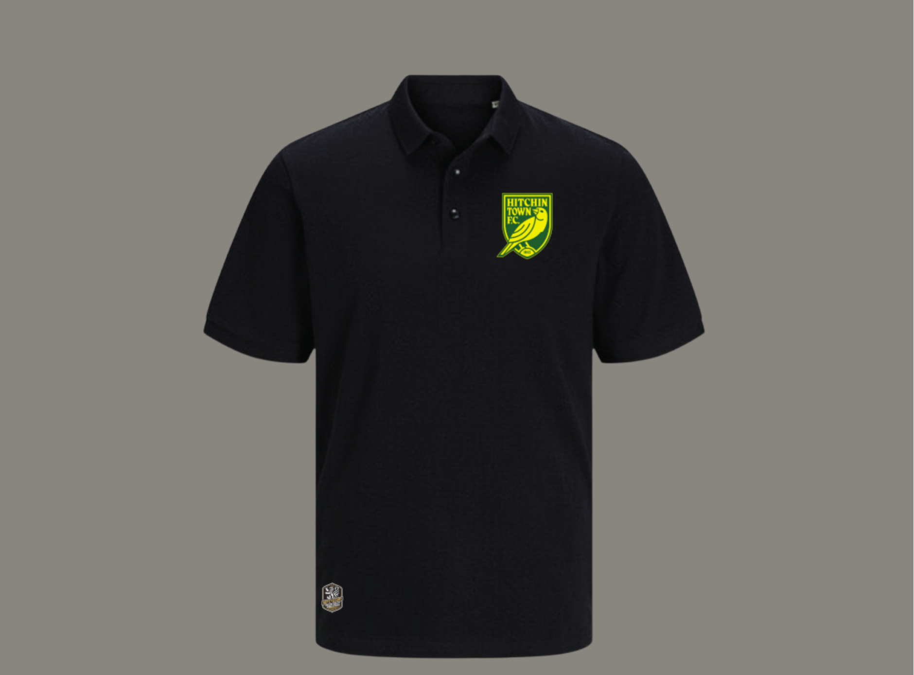 Hitchin Town Football Club Unisex Black Polo shirt, manufactured by Hope and Glory. Chest sizes are as follows: